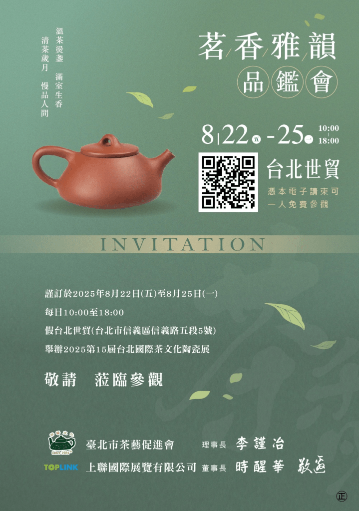 2025年全台最大的茶藝盛會,將於8/22-25在台北世貿隆重登場,邀您至第十六屆台北國際茶文化陶瓷展探索茶的無限魅力,體驗茶文化的深厚底蘊。從中式的奉茶分享之道、品茶的精妙講究,到茶具藝術的美感,現代茶文化更是融匯了全球各地的精華。在這次展覽中,您將有機會深入體驗茶文化的多樣風貌與迷人之處。誠摯邀請大家來台北茶展,品味好茶!